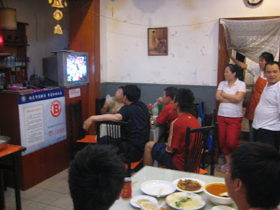 Restaurant owners, cooks and patrons stop to watch the final seconds of China men's basketball's critical game vs. Germany